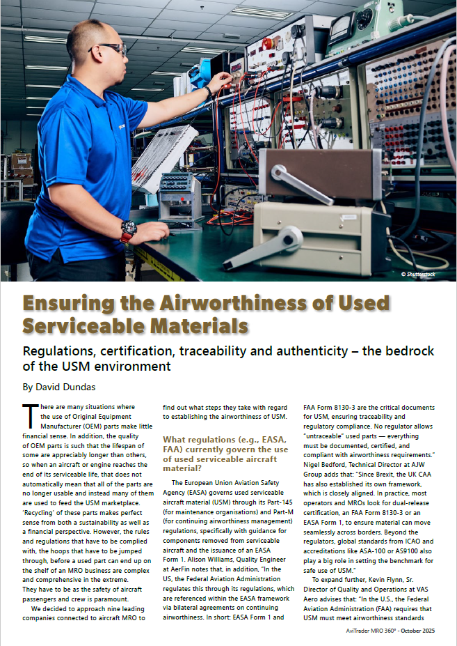 APOC’s VP of Components, Craig Skilton, revealed the process of ensuring the airworthiness of used serviceable material (USM) to David Dundas in the October/November issue of AviTrader MRO360°.